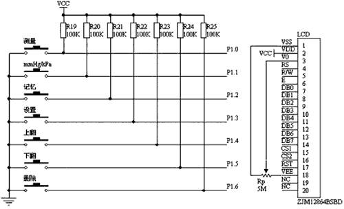 如图6所示,由键盘电路和液晶显示电路两部分组成。液晶显示电路采用ZJM12864BSBD,这是一款低功耗的点阵图形式LCD,显示格式为128点(列)×64点(行),具有多功能指令,很容易与MPU相连。其中键盘电路采用独立式按键,有7个按键,分别为测量、mmHg/kPa转换、记忆、设置、上翻、下翻、删除。可以进行日历时钟的设置,进行报警参数的设置,进行血压的测量值的存取和删除等功能。LCD可以显示收缩压,舒张压,当前的时间和日历;在查询状态时可以实现以往测量血压的日期、时间、测量值,同时可以通过软件编程实现历史数据的图形化显示(例如画出血压波动曲线),方便直观。