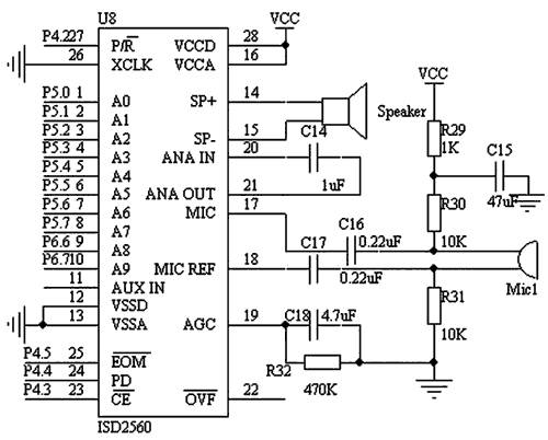 本电路如图7所示,主要由集成语音芯片ISD2560组成。ISD2560是Winbond公司生产的一款具有较强功能的语音录放芯片,是一种永久记忆型语音录放电路,录音时间为60s,可重复录放10万次。该芯片采用多电平直接模拟量存储专利技术,能够非常真实、自然地再现语音。通过事先录制好的声音,实现血压测量值的自动声音提示,如果血压高出正常血压的上下限值,还会发挥报警,提醒使用者就医。