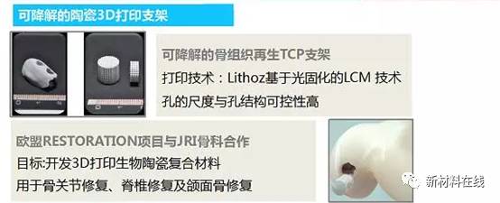 生物陶瓷生物陶瓷具有高硬度、高强度、低密度、耐高温、耐腐蚀等优异性能,在医学骨替代品、植入物,齿科和矫形假体领域有着广泛的应用。但生物陶瓷韧性不高,硬而脆的特点使其加工成形困难,采用3D打印技术制备生物陶瓷,近年来取得长足的进步。