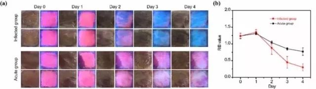 图2. pSi智能绷带在慢性感染伤口(上)和急性非感染伤口(下)表现出的荧光颜色变化