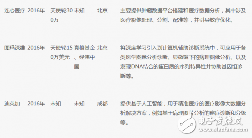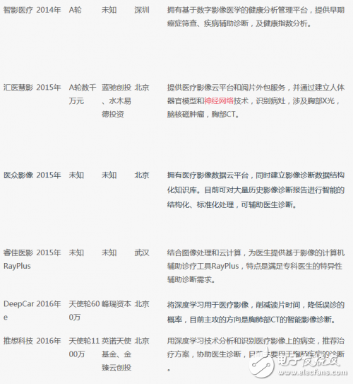 国内目前从事医疗影像智能分析的公司不多,根据公开资料,从众多医疗科技公司中,整理了十多家较为明确涉足将人工智能用于分析医疗影像,从而提高诊断效率和精确性的公司。从这些公司的情况,我们可以一窥国内在这一领域的现状。