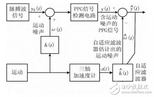 图3 自适应滤波法消除PPG信号中运动干扰噪声原理图