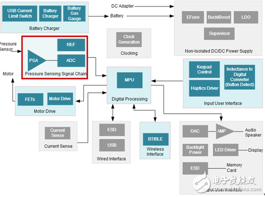 TI血压监护仪可使用科罗特科夫法、振量法或脉搏传导时间法来测量血压。它使用压力套囊、泵和换能器分以下三个阶段来测量血压和心率:膨胀、测量和放气。血压监护仪包括LCD、选择按钮、复位、电源管理和