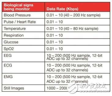 表 1 概括了许多应用的生理信息或生命体征采集所要求的数据速率,这些应用包括慢性病管理或者健康状况管理等。血压监测要求 1-10kbps 的数据速率。如果应用涉及发送静态图像,则要求有 2Mbps 的数据速率。产品开发人员需要知道哪种技术可以支持应用传输数据所需的数据速率。