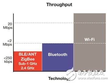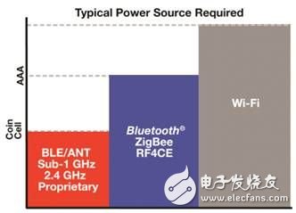 图 3、4 和 5 利用传输距离和数据吞吐量参数,对几种无线网络连接标准进行了比较。图 3 表明蓝牙技术和ANT协议是体域网 (BAN) 最为适合的非专有标准,其要求距离非常短,而且功耗也非常低。图 4 表明就高数据吞吐量而言,Wi-Fi 可能是最为适合的网络连接标准。图 5 显示了不同标准所需的电池类型。从这些图,我们可以清楚地知道 Wi-Fi 要求的功耗比其他几种连接方法都要高。