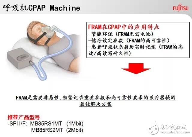 当FRAM用于呼吸机(CPAP)中,同样无需后备电池。设备制造商正在考虑将FRAM用于自动CPAP(连续正气道压力)设备,用来跟踪睡眠呼吸暂停。CPAP监控和记录病人在睡眠时的呼吸数据,在需要的时候帮助病人呼吸。