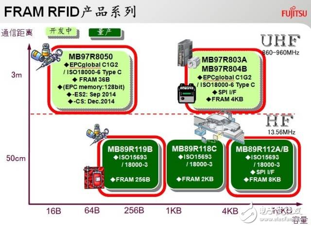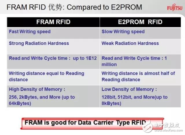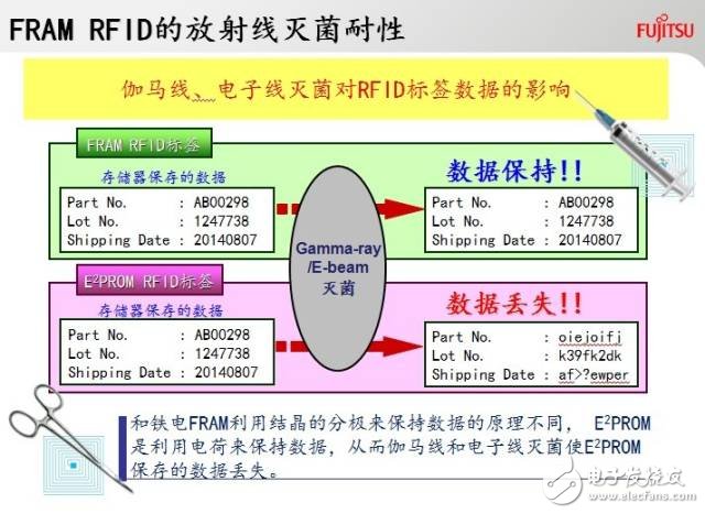 FRAM RFID,其被用于诸如手术台的追溯、药剂盒子、类似于穿刺、血透的管子等中。美国和欧洲的国家会有很多接触到医疗器械的地方,需要经过伽玛放射性消毒,FRAM对辐射有很强的耐受性。基于FRAM的RFID可轻松通过标准医疗灭菌过程,而基于EEPROM的RFID在这一过程中信息会被破坏。