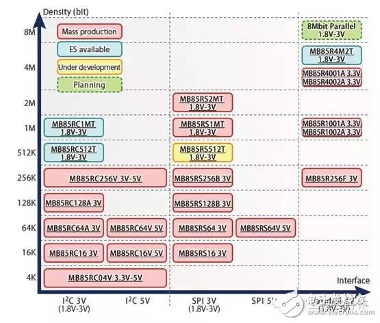 有生产具有众多优异特性的FRAM技术做支撑,富士通半导体为客户提供了各种产品线,包括独立的FRAM和面向特定应用的LSI,如RFID(射频识别)IC、验证IC和其他采用FRAM的产品。独立FRAM主要用于智能电表。以模块形式提供的独立FRAM兼容3种接口:SPI、I2C和并行接口,密度分别为4Kbit–256Kbit、16Kbit-2Mbit和256Kbit至4Mbit(图2)。为了响应客户对更小安装面积的要求,16Kbit I2C和SPI接口的MB85RC16和MB85RS16增加了小型8 pin SON封装,尺寸为3mm x 2mm。