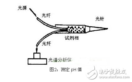 采用光传感器测量 pH 值的原理,是利用透射光和发射光的强度随波长分布光哭进行测定的,在纤维素膜盒中插入两条光纤,然后将针头插入血管或者组织中,试剂会和体液混合,吸收特定波长的光,然后使用分析仪将测量这种变化,分析后即可得到组织或者血液的 pH 值。