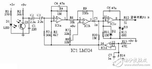 IC1c在工作时,凡有输入信号时,它会在输入信号后沿到来时输出高电平,从而使C6通过R11充电。大约持续20ms之后,IC1c同相输入端的电位会因C3充电电流减小而降低,当此电位低于反相输入端的电位时(尖脉冲已过去很久), IC1c就将改变状态并再次输出低电平。这20ms的脉冲时间是与脉搏同步的,这种脉冲在电路工作时是与红色发光二极管D3的闪烁情况相对应的。
