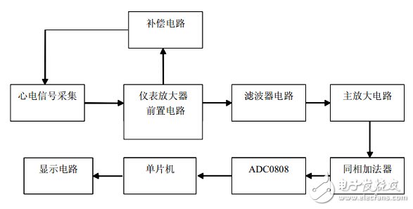 对于心电信号的采集,采用标准导联方式进行采集。心电信号是一种微弱的电信号,要先利用前置放大电路将信号放大 8 倍。由于人体信号源中存在各种噪声干扰,为了抵消这些干扰,可以设计一个补偿电路。对于放大以后的信号,让它通过滤波电路进行滤波。 心电信号中存在 0.05Hz 以下的频率信号、 105Hz 以上的频率信号和 50Hz的工频干扰信号,需要让心电信号依次通过低通滤波器、高通滤波器和带阻滤波器,经过滤波电路以后的信号变的比较干净。然后为将心电信号放大到伏特级别,让其通过一个主放大电路。同时,为了便于单片机和ADC0808 的信号采集和处理,可以让心电信号通过一个加法器电路,将波形提升到 0V 以上。然后通过显示电路让经过单片机处理的信号显示在液晶屏上。整个系统的结构图如图1 所示。