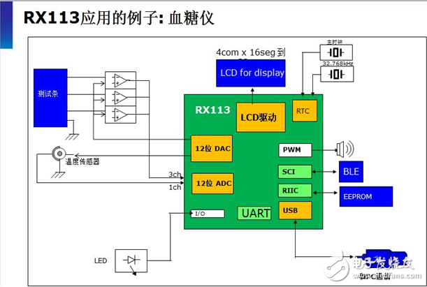 RX100系列32位MCU可同时实现高性能和低功耗,从待机模式快速唤醒仅需4.8微秒,具有极高的性价比:- 3.08Cormark/MHz。由于该系列产品可与瑞萨其他RX产品共享同样的开发平台,缩短了产品的开发周期,并且与现有的RX200系列和 RX600系列兼容与扩展。RX100系列产品包括RX113、RX111、RX110,世强推荐客户在血糖仪中使用RX113。原因在于,RX113不 但加入了LCD控制器,而且具有适用于电池供电应用的模拟功能(12位DAC、12位ADC支持高进度采样),同时USB支持Host/Function /OTG和 BC1.2,增强了通信功能,并且通过组合使用RX113的外设功能,能实现高附加值的系统设计。此外,RX113增加了新的电容触摸按键IP,具有以下 4个特点:高灵敏度—可以透过10mm亚克力板,支持300mm接近传感器;高噪音抑制能力—比IEC 61000 4-3/4-6 level3更好的性能;增强开发工具的功能—开发工具可实现自动调整;支持互感功能—增强防水功能,支持阵列识别,增加电容触摸按键的数量。