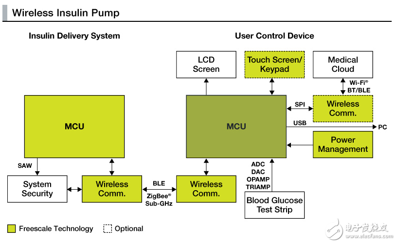 胰岛素泵是一种医疗设备,用于1型和2型糖尿病患者的胰岛素给药。无线胰岛素泵采用射频技术,在一次性胰岛素给药贴片和手持控制器之间建立连接。该手持控制器可用于调节血糖,推荐所需的胰岛素剂量,根据食品数据库提供参考食谱,并将数据上传到医疗云服务,以便进行共享和分析。飞思卡尔提供高集成度、低功耗的无线MCU和MPU,具备高分辨率的图形功能,可满足胰岛素泵和控制器的需求。
