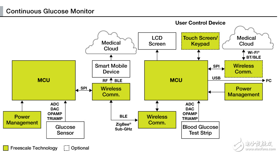 持续血糖监测仪(CGM)用于实时测量1型和2型糖尿病患者血液中的葡萄糖含量。持续血糖监测仪使患者能够更频繁地调整用药剂量,通过移动设备接收通知,无线连接到医疗云服务,并更准确地调整胰岛素用量。它为用户提供了一种简单易用的方法,能够实时、无痛地采集血糖读数。Kinetis系列的ARM® Cortex™ MCU提供高度集成、低功耗、互联的解决方案,可满足这种应用的需求。