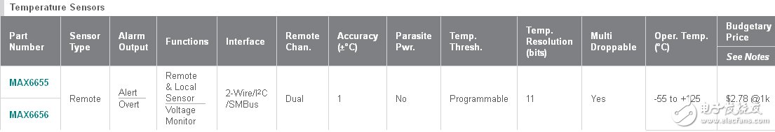 MAX6655/MAX6656是精密的电压、温度监视器。数字温度计提供两个远端传感器的温度及自身管芯温度。远端传感器是连接成二极管形式的晶体管, 一般可采用低成本、易安装的2N3906 PNP管,用以替换传统的热敏电阻或热电偶。多家晶体管制造商均可提供远端测量精度达±1°C的产品,无需校准。远端通道还可以测量微处理器等其他芯片的 管芯温度,只要内部包含基底连接的PNP管、且集电极接地,基极和发射极可用来进行温度检测。温度按照11位的分辨率进行量化。