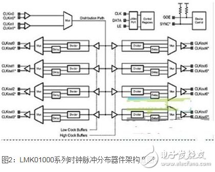 在CT成像和其它类似的数据采集系统里,时钟会限制那些以时间为基础的系统的性能和数据转换效果。为了保持高速时钟干净,信号采用差分形式如LVPECL或LVDS分发。因为它们要在信道板上传输,在驱动负载(如大FPGA)和调整板布局歪斜时,时钟脉冲的分布都会受到影响,即影响边沿脉冲的到达时间。为了解决该问题,半导体供应商创建了允许工程师通过可编程延迟及重新驱动时钟信号的“解决”歪斜问题的时钟分布器件。图2所示的是美国国家半导体LMK01000系列时钟脉冲分布器件的框图,该器件不仅可以控制校正偏差,还可控制可编程分频器、多路复用器和输出驱动器。这对于能实现管理时钟和减少时序错误的系统内可编程性能是至关重要的。