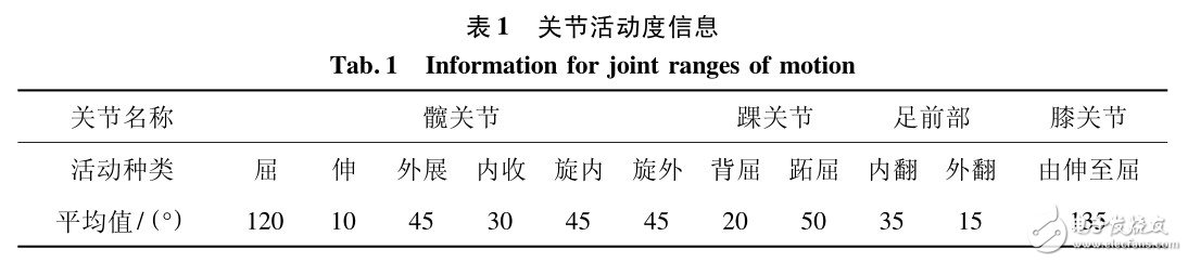 人是人-机-环境系统中的主导因素。 在人体运动位置检测中,高速摄影机实地拍摄是最常用的方法。 由于这种方法是非接触式的记录,因此不影响人的实际运动,最能真实反映人的实际运动情况。 对于该文的研究来说,上述检测系统显得过于庞大,且受到空间的约束,显然不适用。 因此,采用一种即实用又简捷的运动信息检测系统是该文研究中必要环节。从研究方法来说,对对象进行研究离不开对对象进行合理的抽象,当分析各种动作时,姿势分析特别是人体各部分之间的相对位置分析是关键,将特定时刻各个关节点的位置连接起来,就能形成棍状链式结构,将人体下肢简化为一个多杆多关节棍状链式结构,也就是一个具有有限运动自由度的系统,如图 1 所示,以此结构作为计算模型对人体各部的运动和整体运动进行运动学及动力学分析。 表 1 为各关节活动度信息。