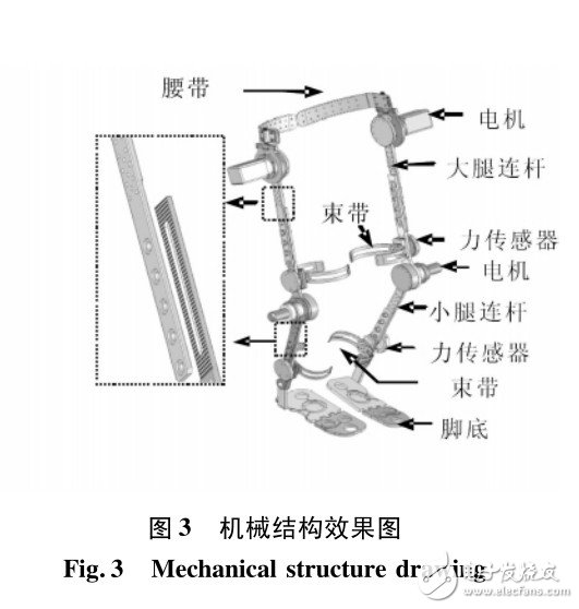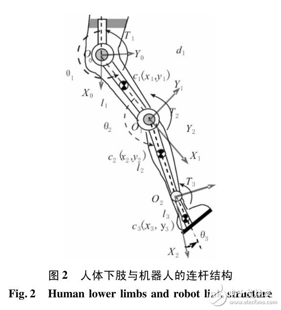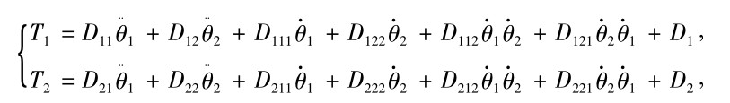 当步行助力机器人提供 100%助力时,这意味着助力机器人系统完全成为一个搭载器,对于下肢助力机器人来说,人的下肢就是其负载,人体下肢各段分散于装置各段连杆之上,这点与普通操作臂型机器人不同(负载主要集中在末端)。 图 2 为人体下肢与机器人混合图,图 3 为机器人的机械结构效果图。由图 2 中参数,利用二阶拉格朗日方法得髋关节和膝关节处力矩 T1和 T2的动力学方程式: