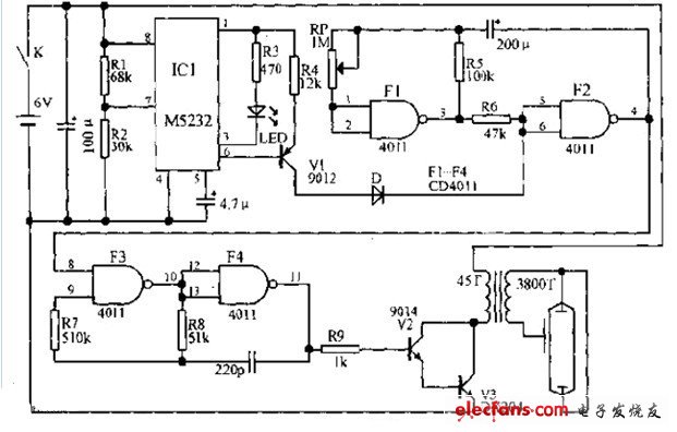 LED发亮,M5232的6脚输出低电平,振荡电路开始工作,并通过V2、V3驱动臭氧发生电路工作。电池电压小于4.2V时,M5232的6脚输出高电平,振荡器停振并关闭臭氧发生电路,同时指示灯闪烁,提醒更换电池。腋臭治疗仪电路如图所示: