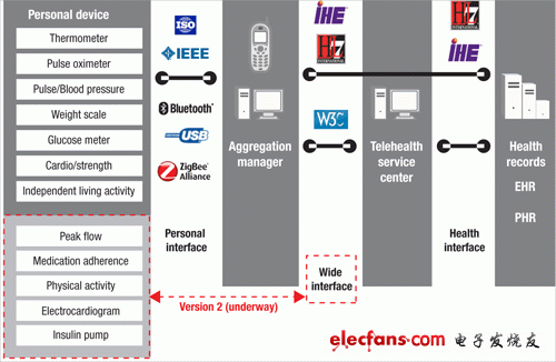 Continua Health Alliance 是一个由医疗设备原始设备制造商 (OEM)、服务供应商以及硅芯片厂商组成的团体,各个厂商协调工作,共同为个人医疗设备与集合管理器 (AM) 制定互用性指南。尽管该指南的 1.0 版将蓝牙 (Bluetooth®) 与通用串行总线 (USB) 确定为标准接口,然而今后的新版指南还将包括蓝牙低能耗 (BLE) 技术与 ZigBee,分别作为低功耗个人局域网 (PAN) 和局域网 (LAN) 接口。OEM 厂商目前使用包括以太网、Wi-Fi 以及蜂窝接口(如适用于AM WAN 的 GSM 等)的组合。成为 Continua 认证的 AM,器件必须集成至少一个 PAN 或低功耗 LAN 接口以及一个 WAN 或因特网协议接口。由于许多厂商都希望同尽可能多的设备实现互操作性,因此通常会集成多个低功耗 LAN/PAN 和 WAN 接口。
