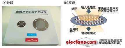 (a)是村田制作所开发的金属网元件。使标靶与事先涂抹了宿主的金属网元件发生反应,利用电磁波的频率特性判断宿主与标靶是否结合(b)。(图(b)由本站根据村田制作所的资料制作)