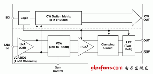 对于大多数典型医学成像应用来说,传感器阵列的每个元件都需要其自己的信号链将传感器的小信号响应传送并转换成一个匹配的小信号响应以进行数字信号处理。因为成像应用传感器的信号响应性质不尽相同,因此信号转换过程中通常离不开三个主要有源组件。首先是低噪声放大器(LNA),其主要功能是将模拟系统的噪声系数 (NF) 尽可能地固定在一个尽可能低的水平。第二个放大器通常是在 LNA 之后,以最佳匹配模数转换器 (ADC) 末级输入摆幅的信号。