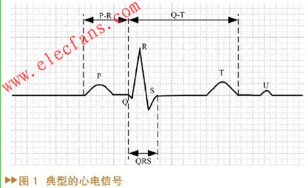 一个典型的心电信号如图1示,它由P波、Q波、R波、S波和T波组成,在诊断过程中可以根据这些特征波的间隔幅值以及P-R间隔、S-T间隔和Q-T间隔判断病人病情。