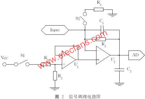 检测系统中信号调理电路如图2所示。仪器开机上电后,单片机控制多路开关S1闭合,前级运放输入为R1和R2分压值,设定为0.4V。根据跟随器和理想运放特性,此时后级输出不变也为0.4V,经过A/D 变换输入单片机,控制显示屏显示“请插入试纸”。当系统插入血糖试纸时,S2闭合,R4引入电路。后级运放构成同相放大器,调整R4使电路输出值为0.6V。经过A/D 变换输入单片机,并控制显示屏显示“请滴血”。滴血后产生的电流信号从“Input”输入,输出电压信号突变并变换后输入单片机,反应结束后根据电压变化计算出血糖值并显示。