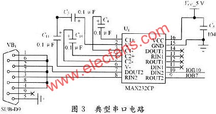 UART是广泛使用的串行数据传输协议。系统主控制器提供了一个全双工标准接口的UART通讯电路模块,用于完成主控制器与外设之间的串行通讯。进行串行通讯时要满足一定的条件,比如电脑的串口是RS232电平,而单片机的串口是TTL电平的,两者之间必须有一个电平转换电路,系统采用了专用芯片MAX3232进行转换。典型的串口电路设计如图3所示。