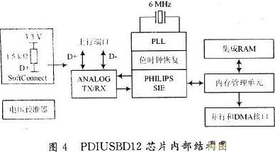 本系统设计采用了USB芯片PDIUSBD12与上位机进行通信,PDIUSBD12是一个性能优化的USB器件,通常用于基于微控制器的系统并与微控制器通过高速通用并行接口进行通信,也支持本地DMA传输。该器件采用模块化的方法实现一个USB接口,允许在众多可用的微控制器中选择最合适的作为系统微控制器,允许使用现存的体系结构并使固件投资减到最小。这种灵活性减少了开发时间、风险和成本,是开发低价、高效USB外围设备解决方案的一种最快途径。PDIUSBD12完全符合USB 1.1规范,也能适应大多数设备类规范的设计,如成像类、大容量存储类、通信类、打印类和人工输入设备等,因此PDIUSBDl2非常适合做很多外围设备。如打印机、扫描仪、外部大容量存储器Zip驱动器和数码相机等。现在用SCSI实现的很多设备,如果用USB来实现可以直接降低成本。PDIUSBDl2挂起时的低功耗以及LazyClock输出符合ACPI,OnNOW和USB电源管理设备的要求。低功耗工作允许实现总线供电的外围设备。PDIUSBD12还集成了像SoftConnect,GoodLink可编程时钟输出、低频晶振和终端电阻等特性。所有这些特性都能在系统实现时节省成本,同时在外围设备上很容易实现更高级的USB功能。PDIUSBD12芯片内部结构图如图4所示。