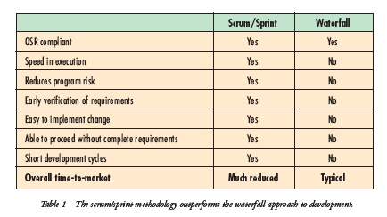 在Scrum/Sprint流程中,我们仅要求高级系统架构和规范即可启动项目。我们将项目细分为4~6个星期长的“Sprint”。在每个“Sprint”中,我们可确定我们认为流程将会要求的所有任务,并将其置于“燃尽”列表(burn-down list)中。图5与图6显示了相关流程图。HEI在全公司范围内使用Scrum/Sprint开发流程,不仅将我们的开发进程加快了30%,而且还使我们提前数月完成了新产品的实施。表1对瀑布式开发与Scrum/Sprint开发方案进行了比较。