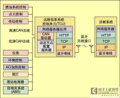 图1显示了使用基于蓝牙的诊断系统进行访问的车内网的网络架构。具有蓝牙功能的常规笔记本电脑上的网络浏览器是用来访问TCU的,它提供了一个访问汽车网络的用户接口。通过在汽车自身嵌入诊断接口,制造商可以定制数据的描述形式和提交给技术人员的过程。还可以根据特定汽车内的选件安装情况来提供诊断程序。除了消费者挑选的诸如空调、ABS等选件之外,通常还有一些其它的部件差异是消费者所看不见的。例如,在1个型年内可能使用2~3个水泵。把所有这些差异都考虑进去之后,可能会出现几十种组合情况。对特定汽车定制专门的诊断接口降低了导致技术人员陷入迷惘和使用不正确诊断程序的可能性。