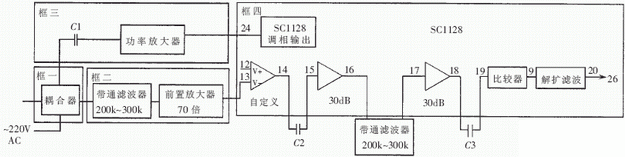 运算放大器(13脚)进行处理。框三为功率放大器,它将SC1128的24脚发出的调相信号进行功率放大,经耦合线圈送入电力线。框四为SC1128内部部分