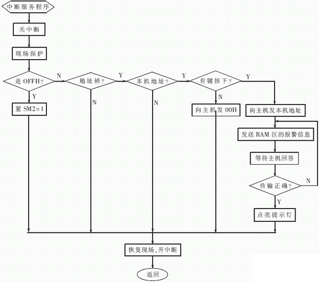 P2.0口通过非门驱动报警扬声器。主机设一个按钮键K,直接连在INT0上,K用于撤消报警声和LED数码管所指示的报警源。该电路采用的备用电源及掉电保护电路和时钟振荡方式与呼叫源电路相同。监控系统程序流程图如图6所示。