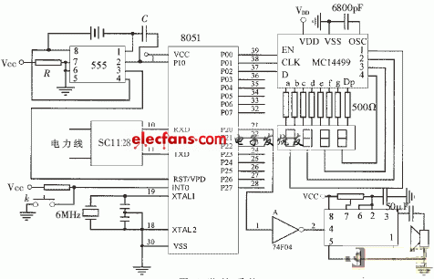 监控系统由8051单片机(主机)、显示装置、报警电路、SC1128芯片及一些外围电路组成,如图5所示。8051单片机P0口的三条I/O线,提供 MC14499所需的时钟信号、使能信号和串行数据,MC14499驱动和控制四块