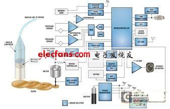 胰岛素泵是一种便携式医疗设备,图1中设备,胰岛素泵还必须包含全面的自检和故障显示功能,从而需要额外电路以及使用具有自检功能的器件。