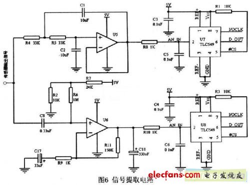 从压力传感器出来的信号是脉搏波的振荡信号和静压力信号的混合信号,还夹杂着来自外界的高频干扰、直流或低频分量。我们将混合信号分为两个部分,一部分经过低通滤波器后进行A/D转换,从而提取出袖带压信号,另一部分则通过带通滤波、放大电路,得到放大的脉搏波数据后再送入A/D转换模块。信号提取部分的具体电路如图6所示。