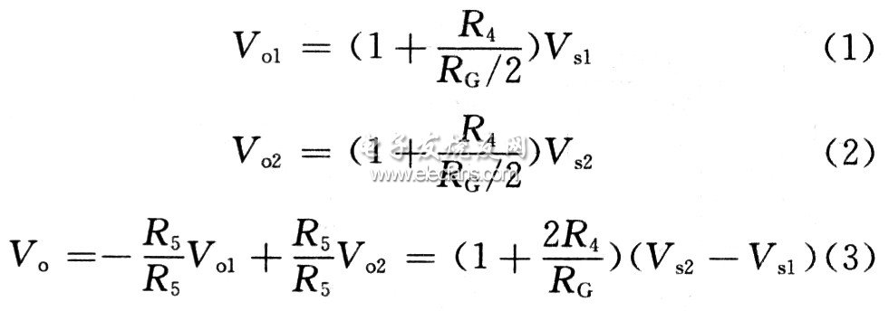 INA2128内部是由过压保护电路和三运放组成的性能优越的测量放大器;A1和A2组成双端输入/双端输出的差动放大器,由于信号从两个同相端输入,使输入阻抗高大10 MΩ以上。第二级又采用差动输入,在运放参数和R5严格对称时,电路具有很高的共模抑制能力和低温漂。