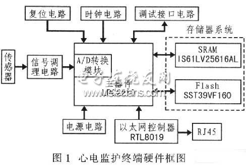 从体积小、功耗低、操作简便的角度设计心电监护终端硬件电路。图1为整个监护终端的硬件框图,主要由调理电路、心电数据采集模块、ARM7微处理器模块、网口模块、电源模块5部分组成。该监护终端完成心电信号的采集和预处理,并通过网口实时发送至监护中心服务器,从而实现远程实时监护。