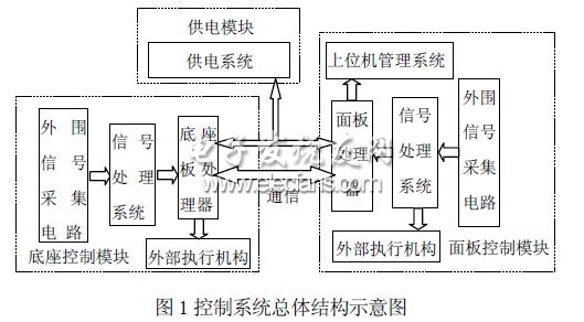 由于牙椅控制系统的控制点较多,且集中于器械盘面板和牙椅底座两个地方,因此本文将牙椅控制系统主要分为三大模块:面板控制模块、底座控制模块、供电模块。