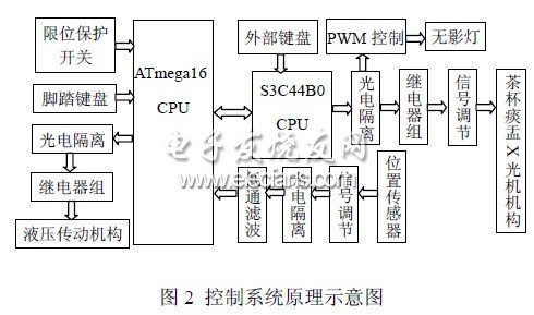 系统整体框图如图1 所示。牙椅控制系统设计必须满足医疗需求并方便使用操作。高档牙椅在实际工作中除了要满足上下仰卧四个基本方向的运动,同时还必须能够完成茶杯给水、冲洗痰盂、无影灯调控、位置数据采集、X 光透射、及与上位机通信功能,还要保证运动的平稳可靠和数据传输的实时性。牙椅控制系统CPU 响应外接键盘输入,执行相应的命令,驱动外部的液压传动机构实现牙椅的运动和其他外部设备的工作。
