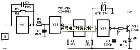 电子脉搏仪电原理图如图1所示。它由传感器(B)、放大器、整形电路和驱动电路组成。整个电路由4个CMOS与非门组成了放大、整形与振荡电路。前端用压电陶瓷片做的传感器,将手指上的脉动压力信号转变为电信号。