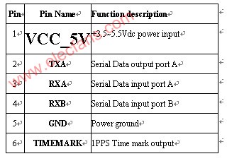 GR-85接收模块采用串行通信方式,其数据格式定义如下:9600b/s,8个数据位,1个停止位,无极性输出。GR-85支持六种NMEA-0183协议信息:GGA,GLL,GSA,GSV,RMC,VTG。这六种信息的区别在于用户所能接收到的信息类型有所差别,例如在RMC格式中有速度的信息,而在其他的格式中却没有。设计者可以根据需要选择响应的信息格式,本实验利用RMC格式。表1为GPS接收模块管脚。接收模块与单片机通讯主要通过TXA脚。