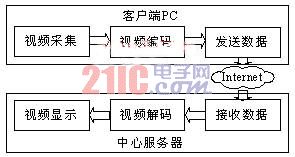远程视频监护的工作流程如图2所示,首先由客户端摄像头来获取视频信号,然后对获取的视频信号进行有效的视频编码,编码后的视频通过网络传输至社区远程监护中心服务器,中心服务器收到视频数据后进行解码,然后进行视频显示。此工作过程中的关键技术主要包括视频编码和视频网络传输。视频技术应用于社区智能远程健康监护中,可以实现医生和病人之间的远程交互诊断,通过视频图像的传输,医生可以实时了解患者的病情状况和精神状态。但同时视频图像信息也给网络带来了大数据量的数据传输的问题,为保证系统监护的实时性,减轻网络传输的负担,本文采用最新数字视频编码国际标准H.264/AVC对视频图像进行编码,然后通过VC++编程实现了远程监护服务器与家庭客户端视频数据的传输,接受方对压缩的视频图像进行解码,然后在给定窗口上重现视频图像,从而实现社区智能远程健康监护系统中视频信息的实时传输。