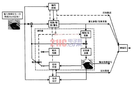 H.264/AVC的编码框架如图3所示。与以前的标准一样,H.264/AVC仍然遵循基于块的混合编码框架。首先将输入图像分割成宏块,利用空间或时间预测去除冗余信息,然后对预测残差进行正交变换得到一系列变换系数。变换使残差系数能量相对集中,再进行量化,按其所含的能量大小分配不同数据量来描述。最后用熵编码进行二进制编码,最大限度消除量化后数据的符号冗余度。解码过程是编码的逆过程,H.264/AVC的详细内容可参考文献[5]。