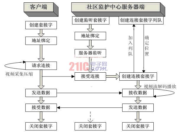 家庭客户端与社区远程监护中心的数据传输基于Windows Socket来实现。Windows Socket支持两种类型的套接字,流式套节字和数据套接字。流式套接字因可靠性高而得到广泛应用。本系统采用流式套接字,中心服务器端建立一个监听套接字和一个连接套接字列队,家庭客户端建立一个通信套接字,中心服务器端先进入监听状态,当收到家庭客户端发出的连接请求后,建立一个连接套接字进行通信,如有其他客户端发来连接请求,则另建立一个连接套接字,加入到连接套接字列队,从而实现中心服务器与多个客户端的数据传输。监护数据网络传输的流程如图4所示。