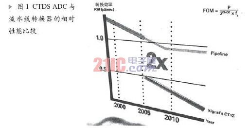 图1示出CTDS ADC 与流水线转换器相对性能比较,此图是根据IEEE认可的FOM(性能因数)测量。FOM是每次转换的能量量测。FOM也示出工艺结构未来的标度,连续时间Δ∑器件将沿给出较高性能水平的路线图发展。