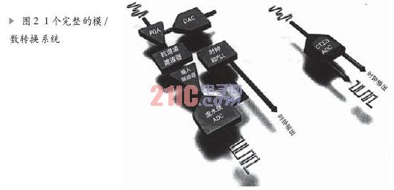 图2标出1个完整的模/数转换系统。左手边的图示出1个完整的系统对于流水线转换器需5个外部电路元件。它们是可编程增益放大器(通过分离的DA进行增益控制);去除噪声的抗混淆滤波器;缓冲ADC本身容性输入的输入驱动器;提供精确定时基准的高性能时钟和锁相环。与此相反,连续时间Δ∑实现方法去除了所需的抗混淆滤波和输入驱动器,而Xignal的实现方法把所有其他功能都集成在片上。