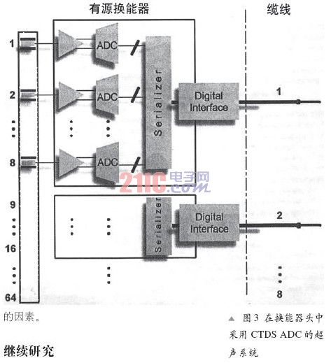 在换能器头中采用CTDS ADC的超声系统简化结构示于图3。除ADC外,有源换能器包含低功率可变增益放大器、串行器和数字接口,这能大大地降低用于互连主处理单元的缆线数量。