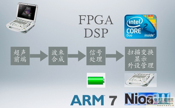据姚力介绍,迈瑞的明星产品便携式彩色超声仪M7中就使用了X86、FPGA、DSP 和ARM等多个平台应对不同工作,其中主处理器采用了性能与价格皆高的Intel CORE 2 duo、信号处理采用运算能力更加强大的FPGA和DSP共同完成、面板部分采用Nios II、电源部分则使用了低端的ARM7系列产品,充分体现了迈瑞选择处理器平台原则中的“多”字。另外一个原则“少”则体现在同一系列的产品一旦选定处理器,今后的几代产品中都将使用同样平台,几乎不会再做更换。